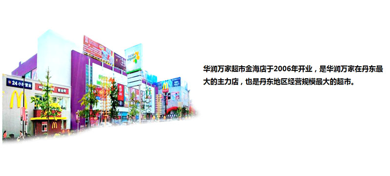金海商業(yè)廣場2004年11月開工,2006年竣工,位于丹東市東部,抵觸丹東東西主干道錦山大街和南北主干道金海路交匯處,是丹東東部地區(qū)的商業(yè)中心??偨ㄖ娣e約10萬平方米,由大型購物廣場、女人街A、B座室內(nèi)步行街、女人街C座、麥當勞、金海寶山批發(fā)城等主要建筑構(gòu)成 。大型購物中心樓前設有露天停車場,并配有先進的車輛停泊管理系統(tǒng),可以滿足整個商圈的停車需求。金海商業(yè)廣場擁有大型超市、五星影城、時尚餐飲、流行百貨、電器賣場、游樂中心、家具工廠店、小商品批發(fā)城等等,通過多種業(yè)態(tài)的錯位經(jīng)營,展現(xiàn)完善的購物、餐飲、娛樂、休閑、文化、旅游功能。