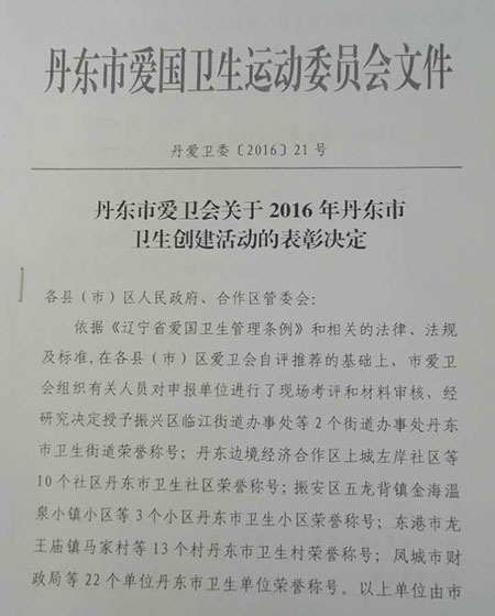 在丹東市愛國衛(wèi)生運(yùn)動(dòng)委員2016年衛(wèi)生創(chuàng)建評(píng)比活動(dòng)中,金海·溫泉小鎮(zhèn)經(jīng)過市愛衛(wèi)會(huì)的現(xiàn)場考評(píng)和材料審核,從參評(píng)的數(shù)十家小區(qū)中脫穎而出,榮獲“丹東市衛(wèi)生小區(qū)”稱號(hào)。