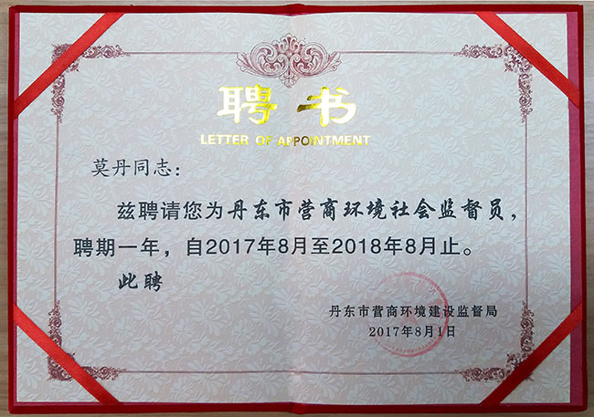 根據市營商環(huán)境建設監(jiān)督局發(fā)布消息,遼寧金海集團總經理莫丹被正式聘請為丹東市營商環(huán)境社會監(jiān)督員。