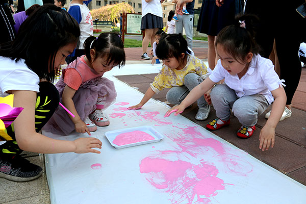 舞蹈結(jié)束后進(jìn)行游戲環(huán)節(jié),為小朋友打造了色彩體驗地帶,準(zhǔn)備豐富的色彩顏料,大家可以在現(xiàn)場用手作畫,讓孩子們發(fā)揮想像,盡情的在上面畫出美麗的童真世界。