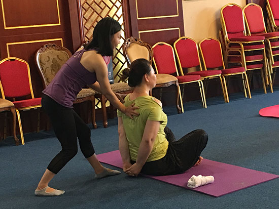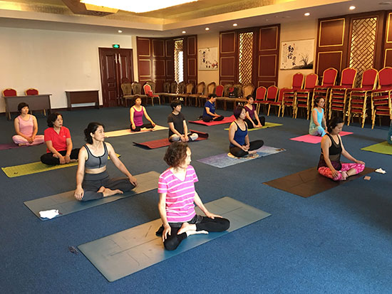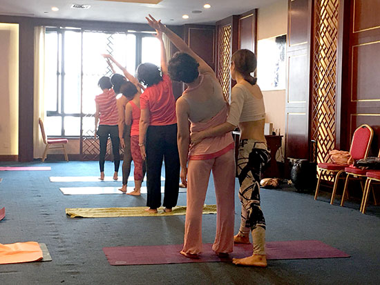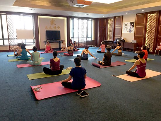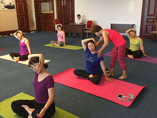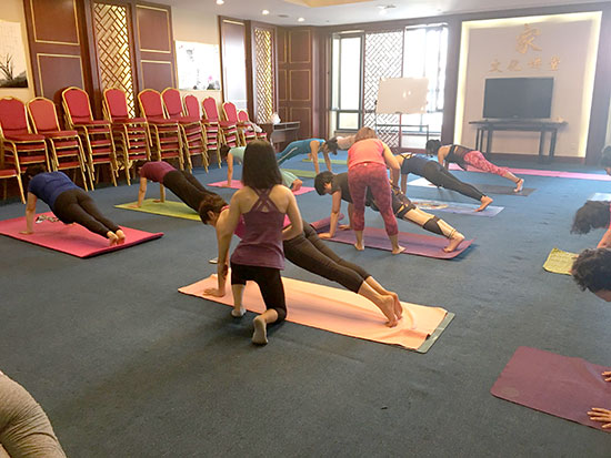 悄悄走近活動(dòng)現(xiàn)場(chǎng),金海大廈三樓大講堂里飄揚(yáng)著舒緩的音樂(lè),伴隨著輕柔的指導(dǎo)聲娓娓?jìng)鱽?lái),20多位業(yè)主們正在專業(yè)老師的帶領(lǐng)下學(xué)習(xí)瑜伽動(dòng)作。
