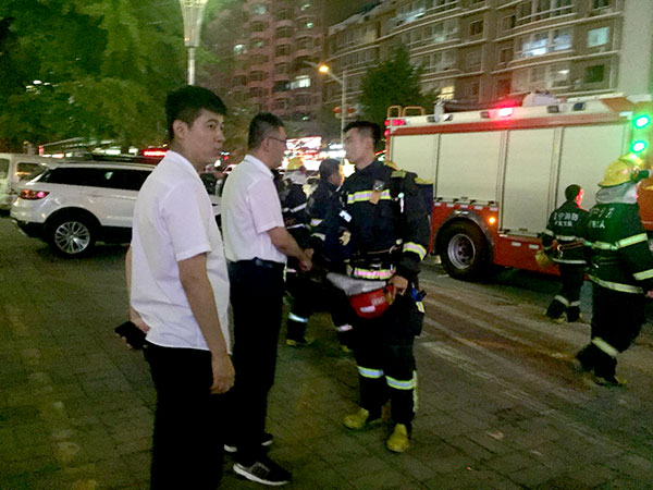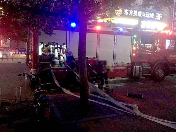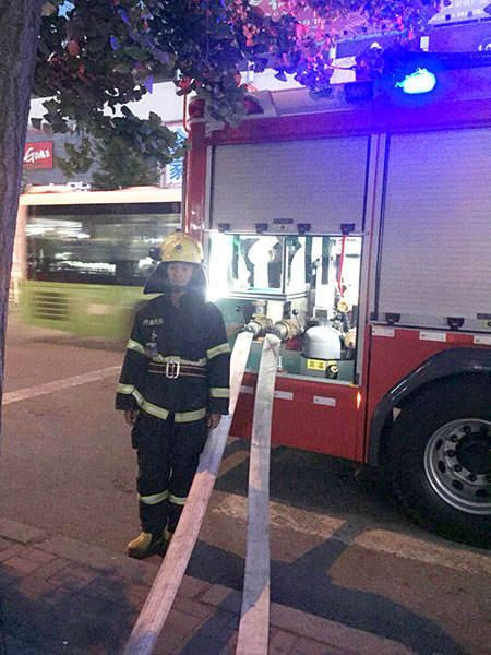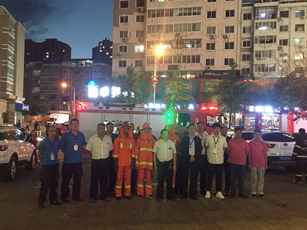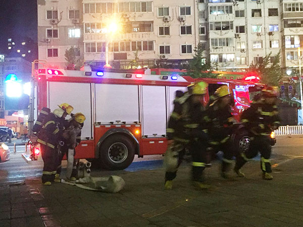 消防特勤隊杜隊長帶領特勤中隊隊員,派出兩輛消防車,商業(yè)公司微型消防站消防人員保安等各部門人員現(xiàn)場配合。演習內(nèi)容為當商場內(nèi)出現(xiàn)火情時第一時間本單位微型消防站人員利用商場內(nèi)消火栓及滅火器滅火,同時撥打火警電話報警,特勤中隊到達現(xiàn)場后配合消防隊員進行聯(lián)動滅火演習。