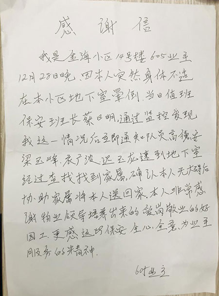 事情雖小,但幾位保安的細(xì)心服務(wù)和體貼到位,讓業(yè)主深受感動,親筆給溫泉小鎮(zhèn)物業(yè)管理部寫了一封表揚(yáng)信,感激他對金海物業(yè)的感激之情。他在信中說,非常感謝金海物業(yè)的領(lǐng)導(dǎo)能培養(yǎng)出這么多愛崗敬業(yè)的好員工,更感謝物業(yè)的保安們全心全意為業(yè)主服務(wù)的精神!