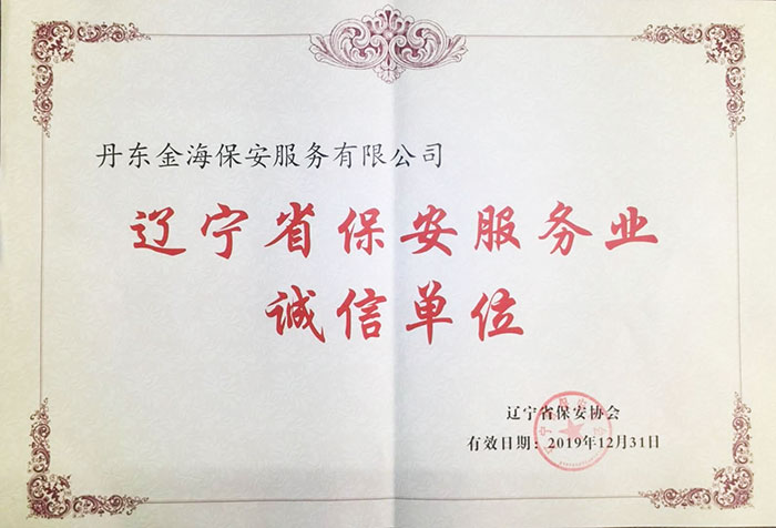 近期,在遼寧省保安協(xié)會(huì)評(píng)選的先進(jìn)單位中,丹東金海保安服務(wù)有限公司喜獲“遼寧省保安服務(wù)業(yè)誠(chéng)信單位”。