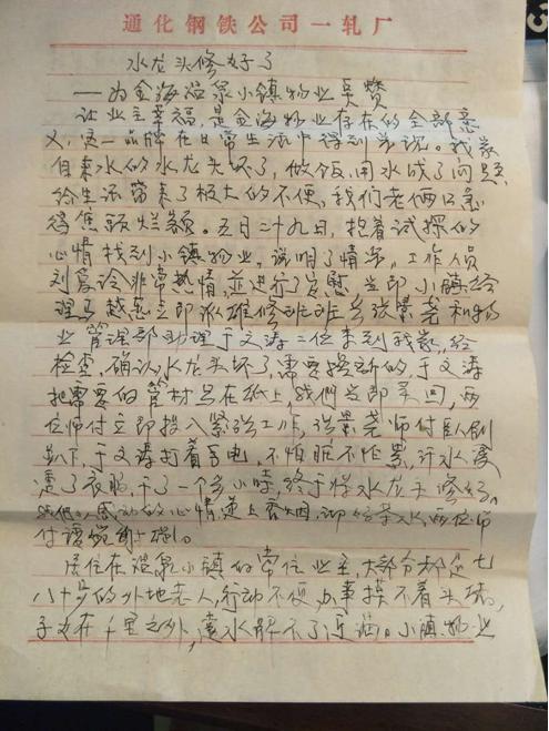 我是溫泉小鎮(zhèn)30號(hào)樓的業(yè)主劉桂芳,我家自來水水龍頭壞了,做飯用水成了問題。給日常生活帶來了極大的不便,我們老倆口兒急得焦頭爛額。5月29日,抱著試探的心情找到金海溫泉小鎮(zhèn)物業(yè),說明了情況。接待我們的工作人員劉愛玲非常熱情,一邊安慰我們,一邊把情況向上匯報(bào)。當(dāng)即,物業(yè)經(jīng)理馬越惠立即派維修班班長張景堯和物業(yè)管理部綜管員于文濤來到我家。經(jīng)檢查,是我家的水龍頭壞了,需要更換新的。余文濤把需要的管材寫在紙上,我們立即買回,兩位師傅立即投入緊張工作,張景堯師傅臥倒趴下、于文濤打著手電,不怕臟、不怕累、汗水浸透了衣服維修了一個(gè)多小時(shí),終于將水龍頭修好。我們懷著感動(dòng)的心情,遞上香煙、沏好茶水,卻被兩位師傅婉言謝絕。