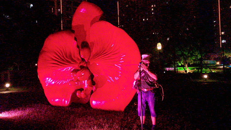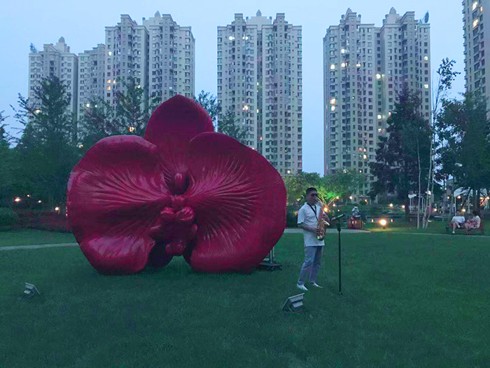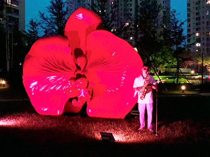 紅花雕塑旁,薩克斯演奏。行云流水,余音裊裊。