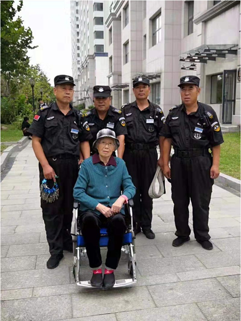那天中午,金海物業(yè)健壯的保安兄弟出場了——郭進、關(guān)德軍、王顯臣、楊永春4名保安氣喘吁吁地爬上8樓,看了情況仔細商議后又回到保安室拿來繩子,把我母親連人帶輪椅抬下了樓。下樓途中,他們細心呵護,不斷地安慰母親別害怕,幫助我們解決了母親出行的困難,使她們兄妹如愿地歡聚一堂。