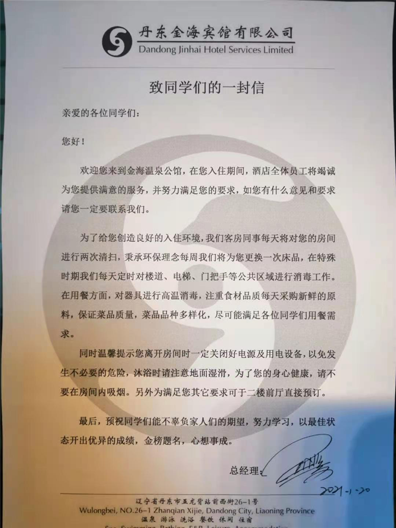 又是一年臨近春節(jié),新冠肺炎疫情再次爆發(fā),給各行各業(yè)造成了不小的沖擊,然爾,金海溫泉公館在這個特殊時期卻迎接了一批“特殊客人”——高考學生。來了,就是丹東人,要讓住在這里的孩子們感受到丹東人的溫暖,金海人的溫暖,這是金海公館這次重要接待的服務口號。