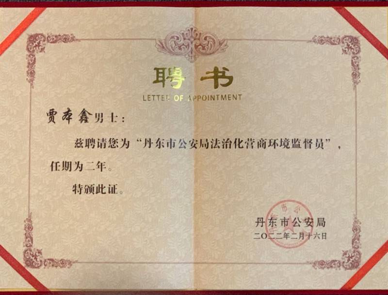 2022年2月16日,金海集團副董事長、總經(jīng)理賈本鑫由丹東市公安局聘為“丹東市公安局法治化營商環(huán)境監(jiān)督員”!